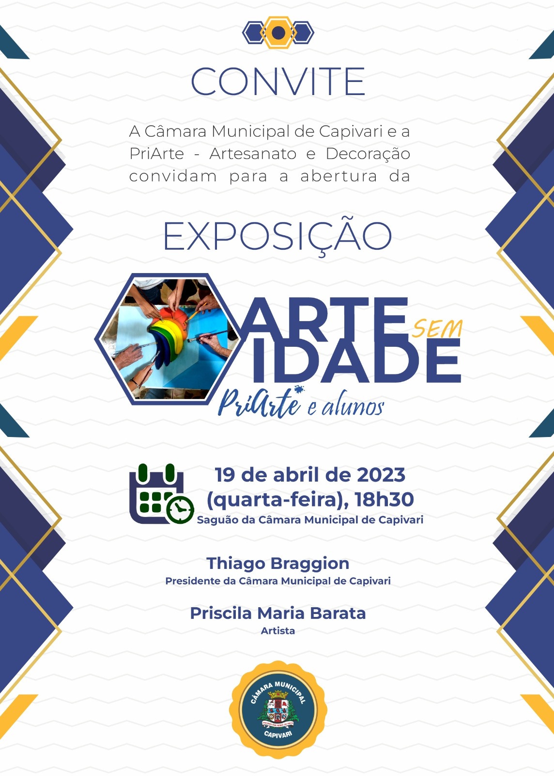 Na próxima quarta-feira, 19, às 18h30, ocorre a abertura da exposição “Arte sem idade”, promovida por Priscila Maria Barata (PriArte) e alunos, no saguão da Câmara Municipal de Capivari, com entrada aberta ao público