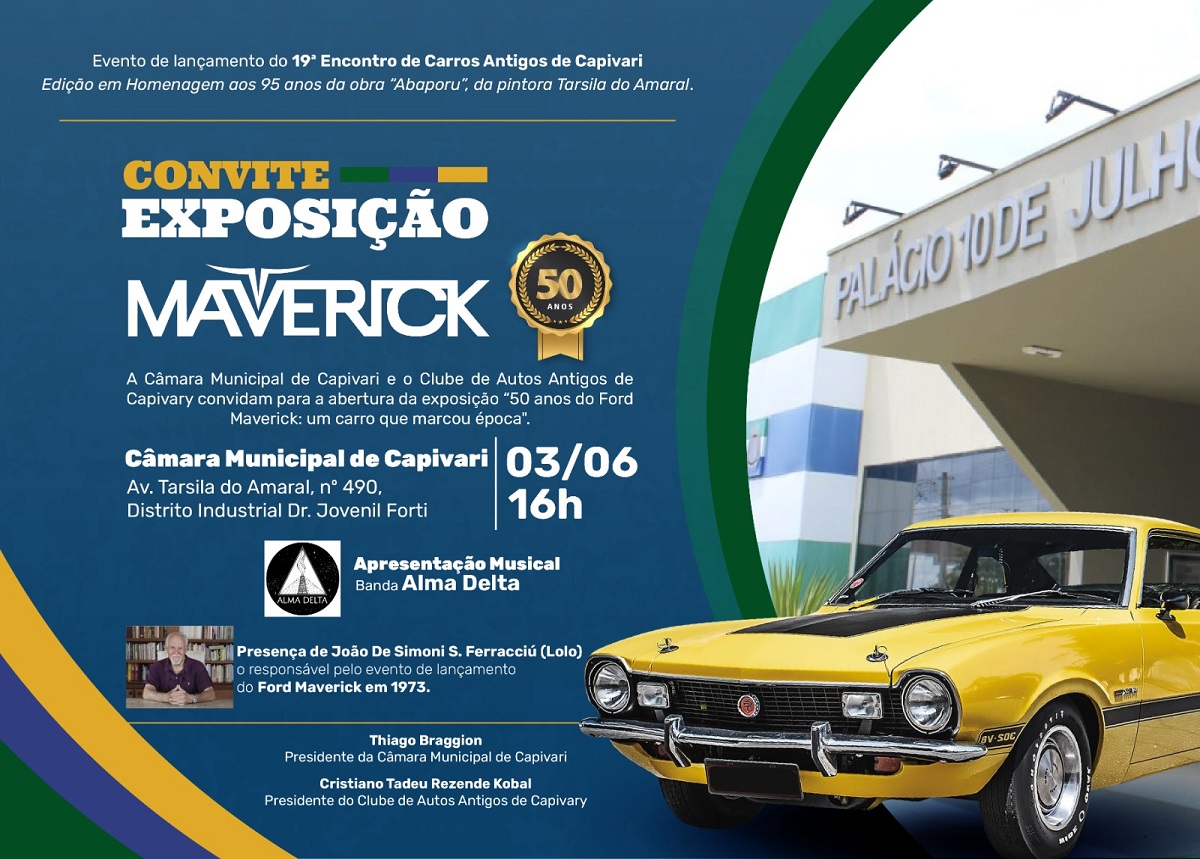 Neste sábado, 03 de junho, a partir das 16h, a Câmara Municipal de Capivari, em parceria com o Clube de Autos Antigos de Capivary, promove a abertura da exposição “50 anos do Ford Maverick: um carro que marcou época”, no saguão da Casa de Leis.