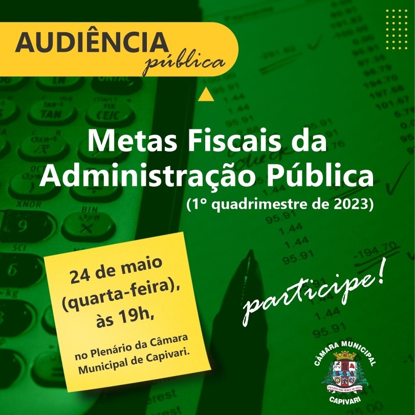 Na próxima quarta-feira, 24, a Câmara Municipal de Capivari promoverá uma audiência pública sobre as metas fiscais da Administração Pública referente ao primeiro quadrimestre de 2023. Será às 19h, no plenário da Casa de Leis.