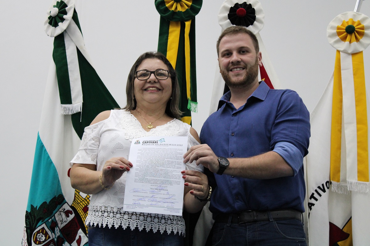Na mesma noite, o vereador Thiago Braggion (PSL) entregou uma Moção de Aplausos à senhora Maria do Carmo da Silva, conhecida como Carminha, que presta serviços voluntários de saúde para mães e crianças recém-nascidas até os sete anos de idade, moradores do bairro Jardim Santa Rita de Cássia.