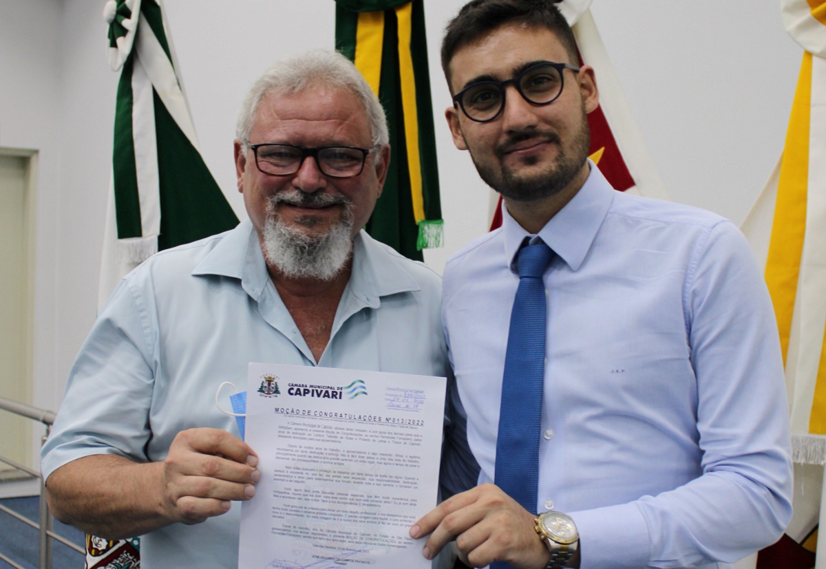 O senhor Fernandes Fornaziero foi homenageado na noite de quarta-feira, 02, na Câmara Municipal de Capivari. Foi entregue a Moção de Congratulações pelos anos de dedicação de Fernandes ao Cartório Tabelião de Notas e Protesto de Letras e Títulos de Capivari. A Moção, de autoria do vereador José Eduardo Pacheco (PL), foi aprovada por unanimidade.
