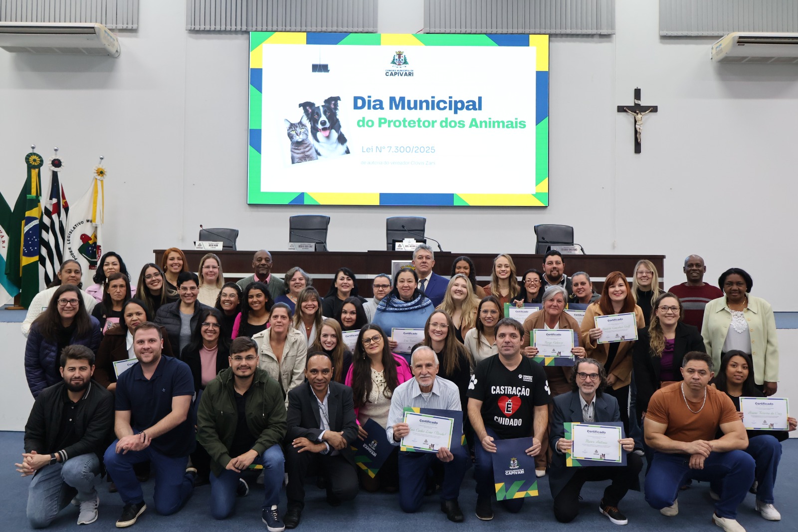 A Câmara Municipal de Capivari promoveu, no dia 11 de agosto, uma solenidade em comemoração ao Dia Municipal do Protetor de Animais, instituído por meio de Lei n° 7300/2025 recém-aprovada de autoria do vereador Clóvis Zani (PSD). A cerimônia reuniu representantes da sociedade civil e cerca de 50 protetores e protetoras da causa animal, que foram homenageados por seu trabalho voluntário e dedicação ao bem-estar dos animais no município.