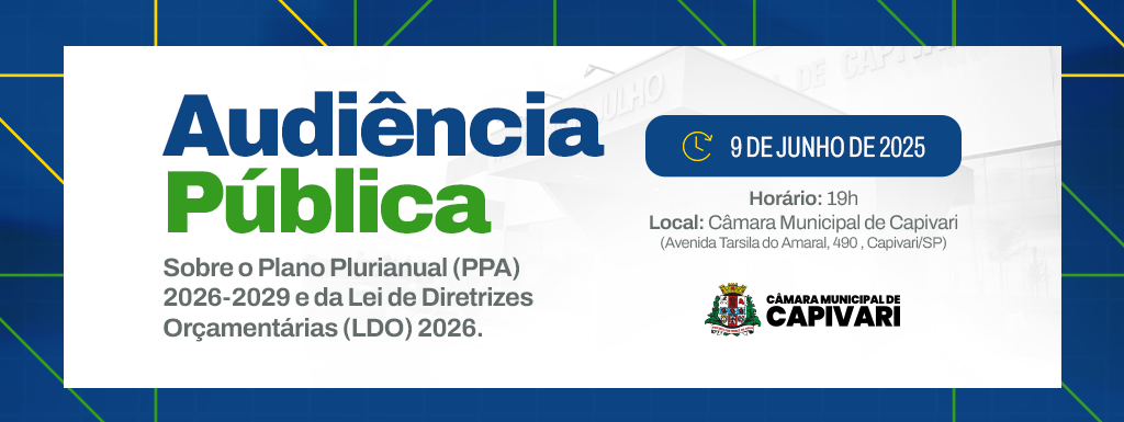 A Câmara Municipal de Capivari convida toda a população para participar da audiência pública que discutirá dois dos principais instrumentos de planejamento e gestão financeira do município: o Plano Plurianual (PPA) 2026–2029 e a Lei de Diretrizes Orçamentárias (LDO) 2026.