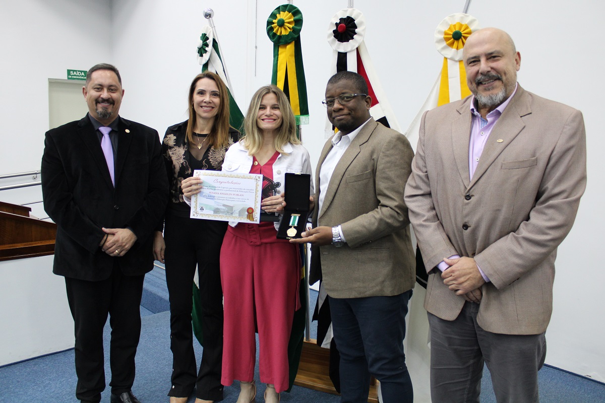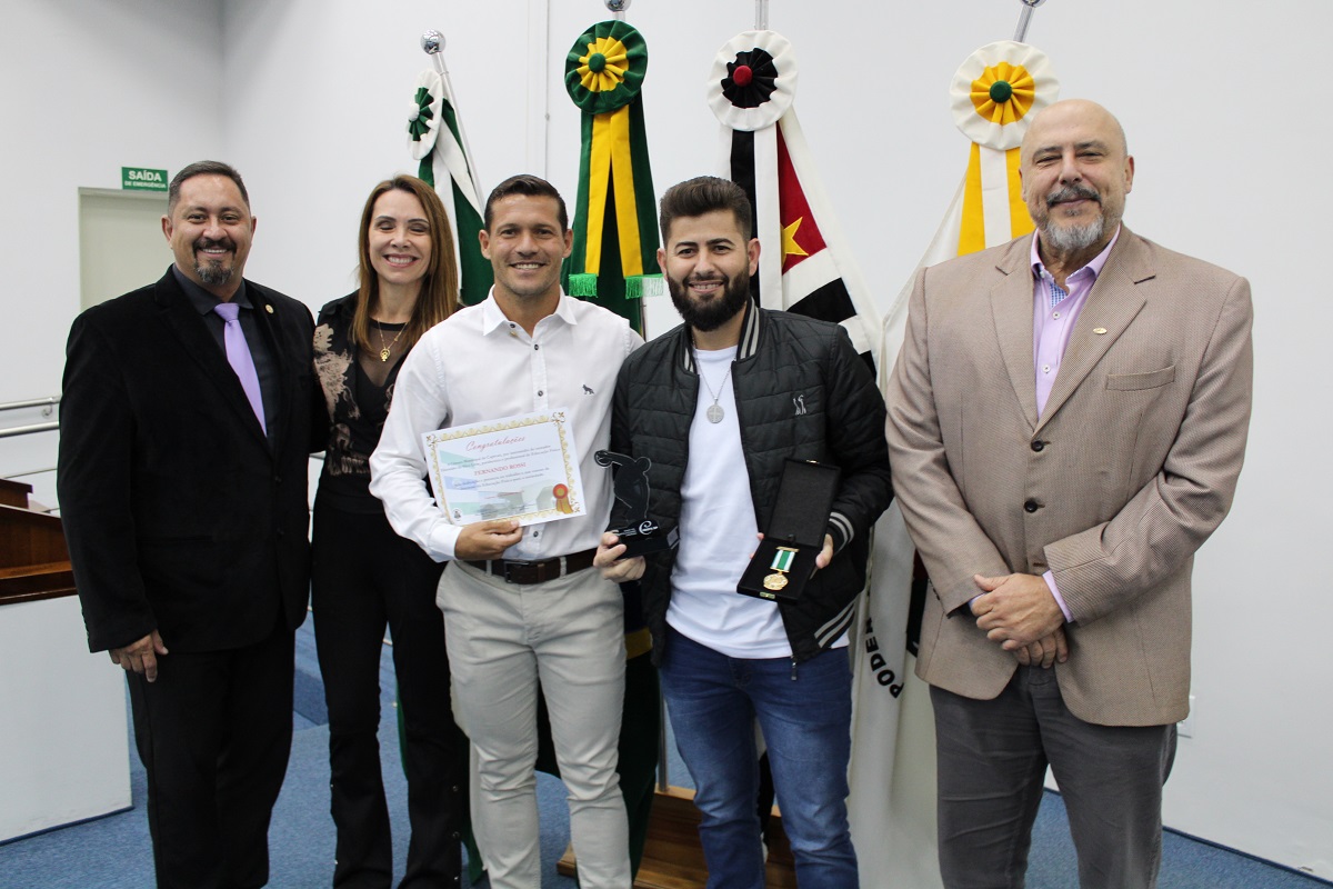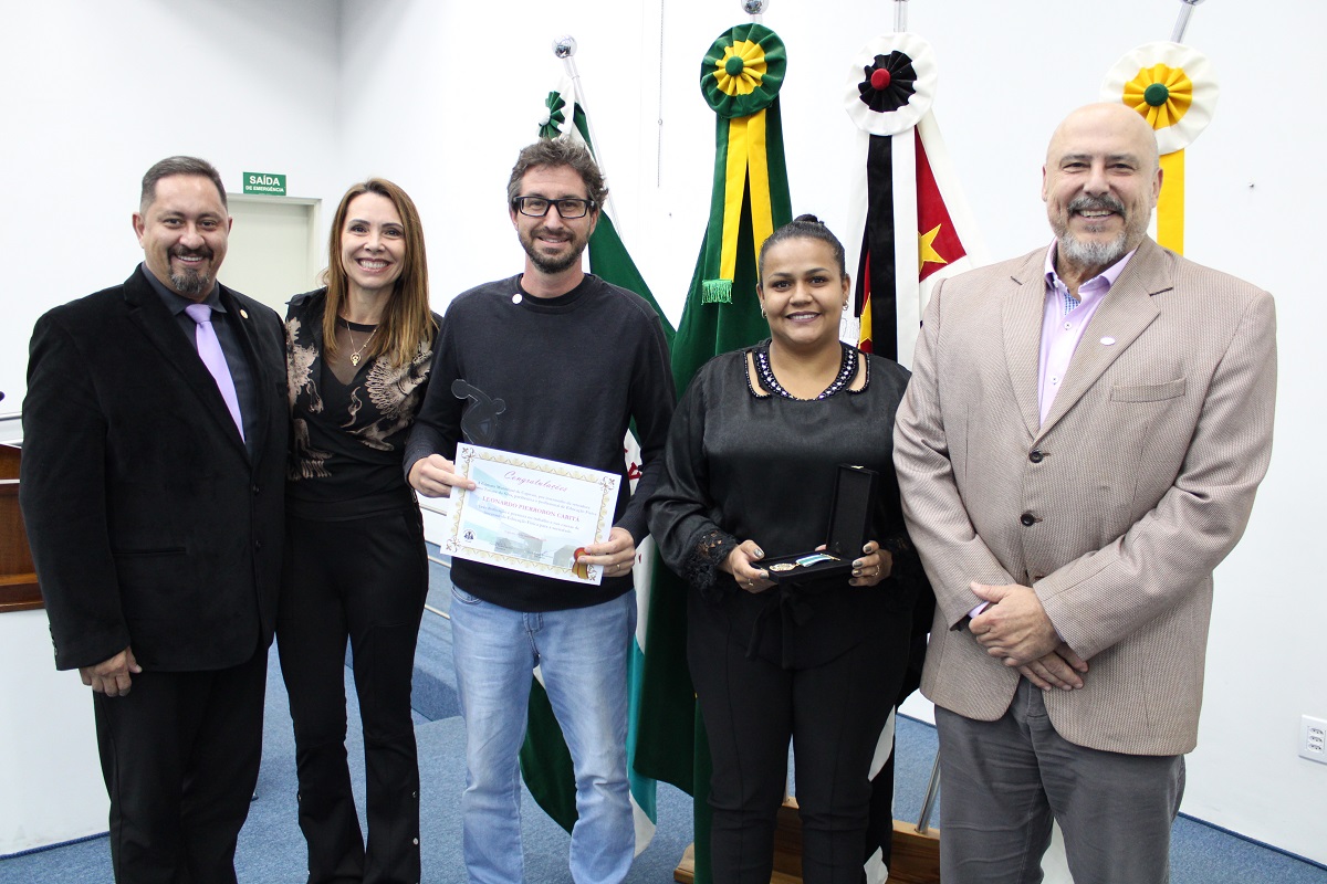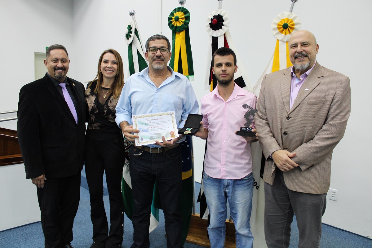 Vereadores, o presidente do CREF4/SP, professor Nelson Leme da Silva Júnior, e o conselheiro do CREF4/SP, Humberto Panzetti, fizeram a entrega das homenagens, dentre elas a Medalha de Mérito da Educação Física, destinada a reconhecer profissionais inscritos no sistema CONFEF/CREF e que tenham se destacado de forma relevante, contribuindo por meio de trabalho ou ações que resultem no engrandecimento da Educação Física.