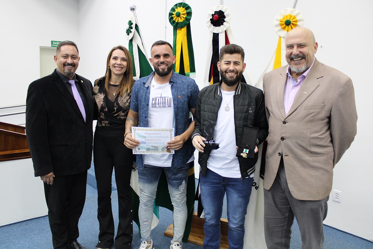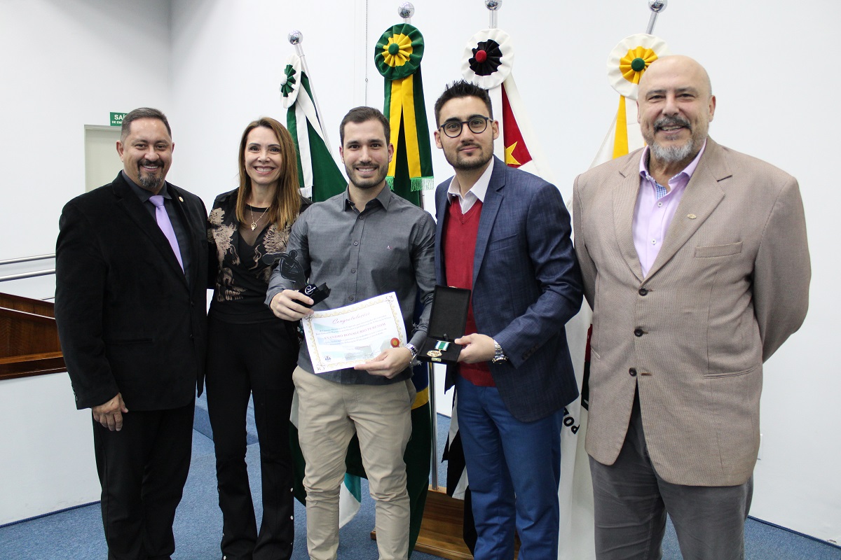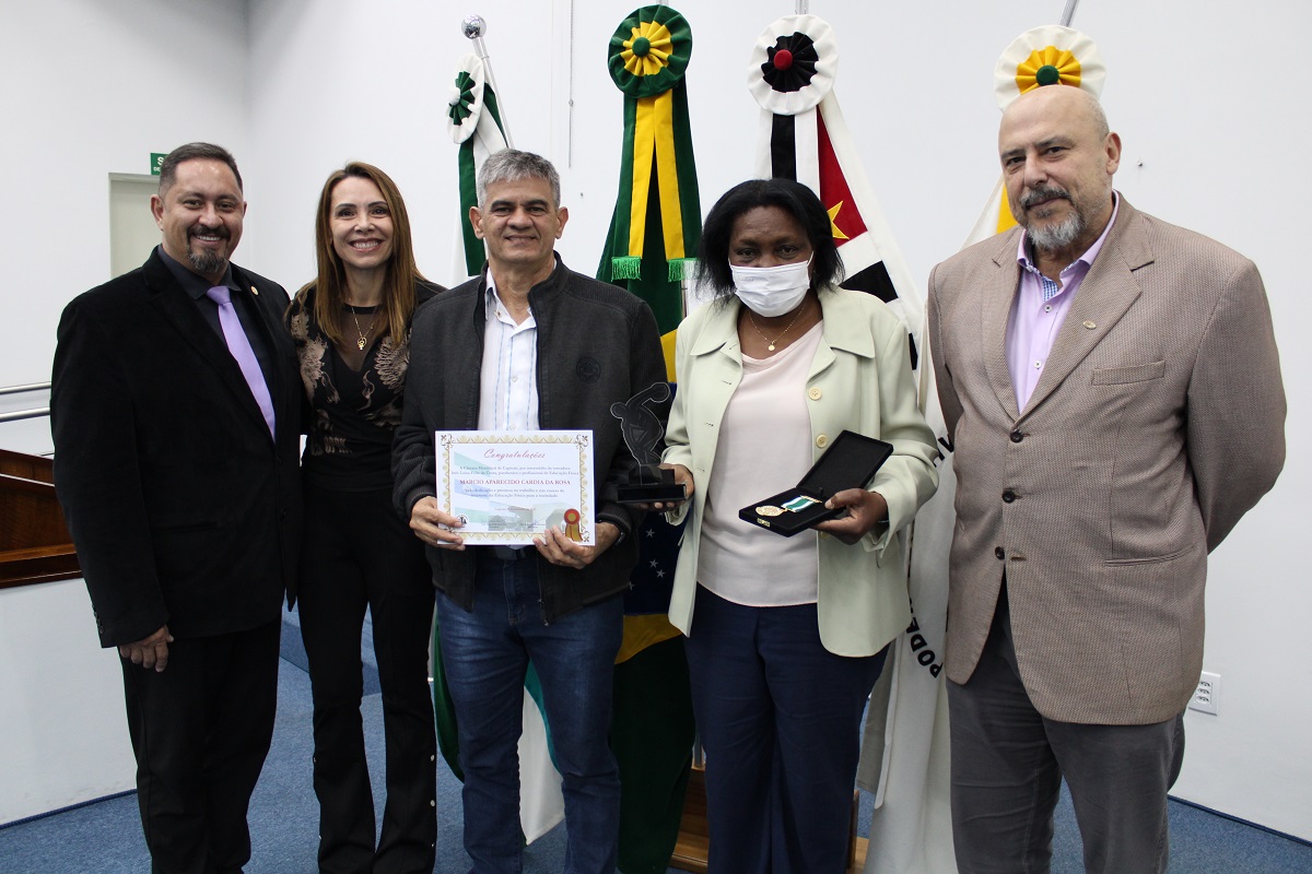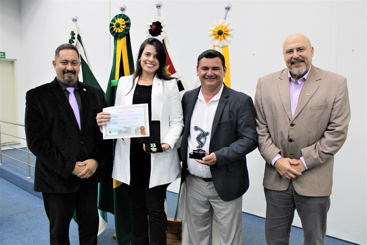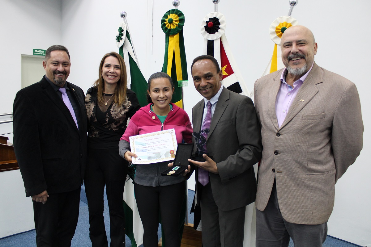 Vereadores, o presidente do CREF4/SP, professor Nelson Leme da Silva Júnior, e o conselheiro do CREF4/SP, Humberto Panzetti, fizeram a entrega das homenagens, dentre elas a Medalha de Mérito da Educação Física, destinada a reconhecer profissionais inscritos no sistema CONFEF/CREF e que tenham se destacado de forma relevante, contribuindo por meio de trabalho ou ações que resultem no engrandecimento da Educação Física.