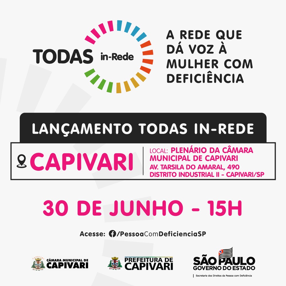 No próximo dia 30, quinta-feira, a Câmara Municipal de Capivari sediará o lançamento no município do TODAS in-Rede, programa de empoderamento às mulheres com deficiência do Governo do Estado de São Paulo. O evento foi intermediado pela vereadora Sele Rosada (União Brasil) e anunciado por ela em tribuna na noite de segunda-feira, 20.