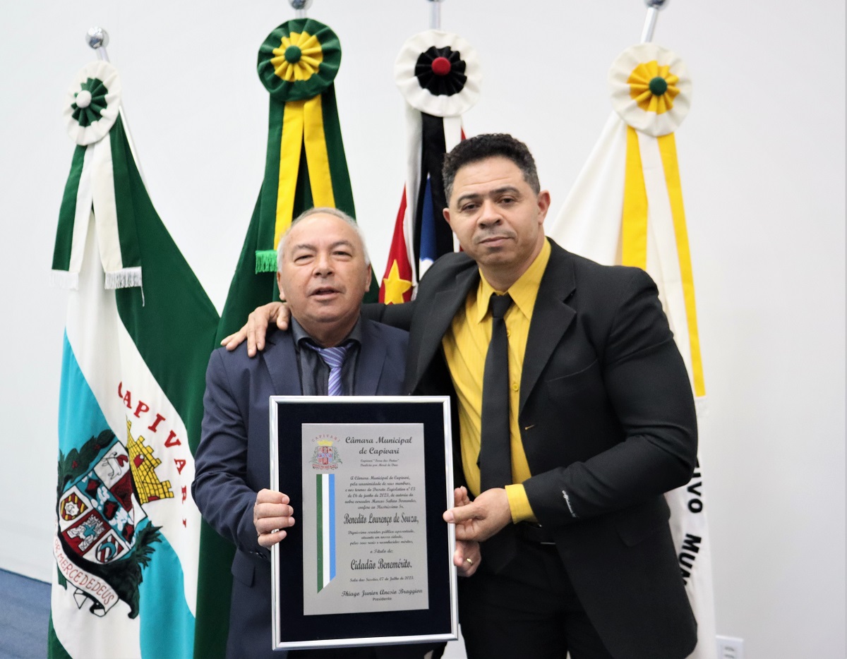 A segunda homenagem da noite foi realizada pelo vereador Marquinho Mineiro (PODE), que concedeu o Título de Cidadão Benemérito ao senhor Benedito Lourenço de Souza, servidor público aposentado. Souza trabalhou como guarda civil por mais de 40 anos, sendo 12 anos como comandante. Ele participou de centenas de prisões de criminosos e recebeu muitos elogios formais ao longo de sua carreira.