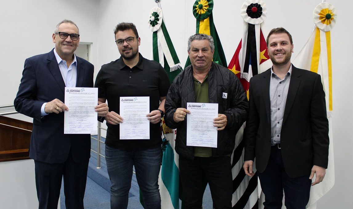 Na noite de segunda-feira, 05, Jorge Pagotto, Luís Paulo Santareli e Onivaldo Cuan estiveram na Câmara Municipal de Capivari para receber, das mãos do presidente Thiago Braggion (União Brasil), a Moção de Aplausos nº 71/2023 ao Capivariano Futebol Clube pela conquista do título do Campeonato Paulista Série A3.