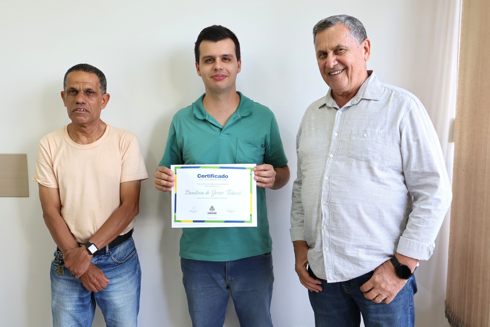 O vereador Ruan Henrique Pellegrini Braggion (MDB) entregou, na manhã desta terça-feira (25), a Moção de Aplausos nº 57/2025 ao Cine Vera Cruz, em homenagem aos 70 anos de funcionamento do espaço, um dos marcos culturais mais tradicionais de Capivari. A entrega ocorreu no gabinete do parlamentar, com a presença do responsável pelo cinema, Davilson de Jesus Talassi, e de Waldo Roberto dos Santos (Baiano), funcionário do cine há mais de 30 anos.
