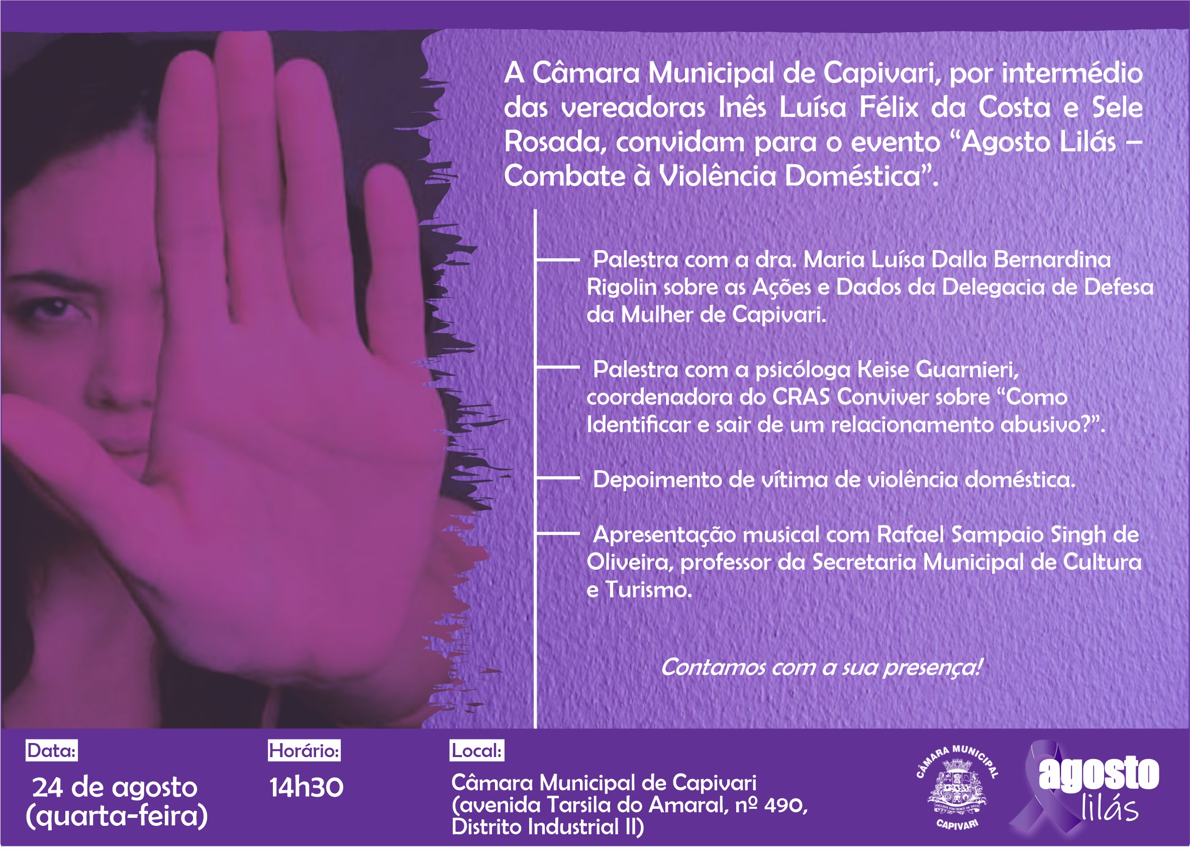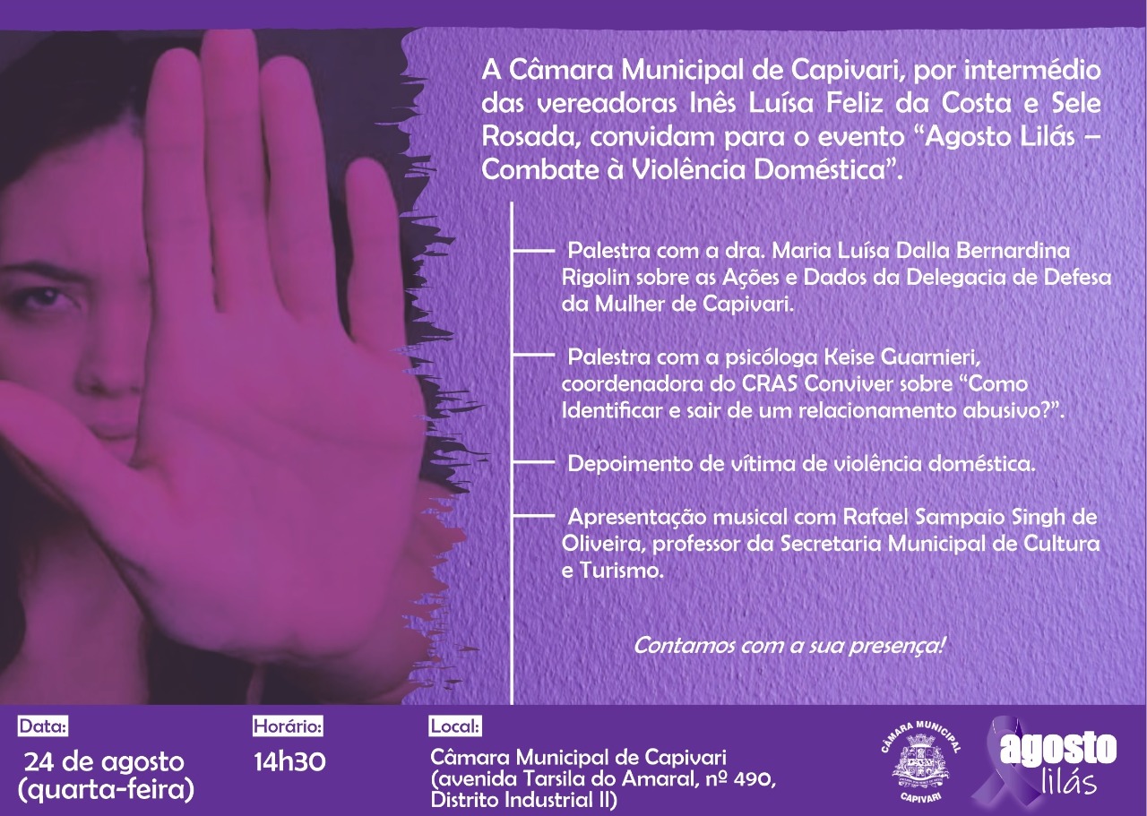 Na próxima quarta-feira, 24, a Câmara Municipal de Capivari promoverá o evento “Agosto Lilás – Combate à Violência Doméstica”, às 14h30, no plenário da Casa de Leis. As vereadoras Inês Luísa Félix da Costa e Sele Rosada, ambas do União Brasil, são as idealizadoras da ação.