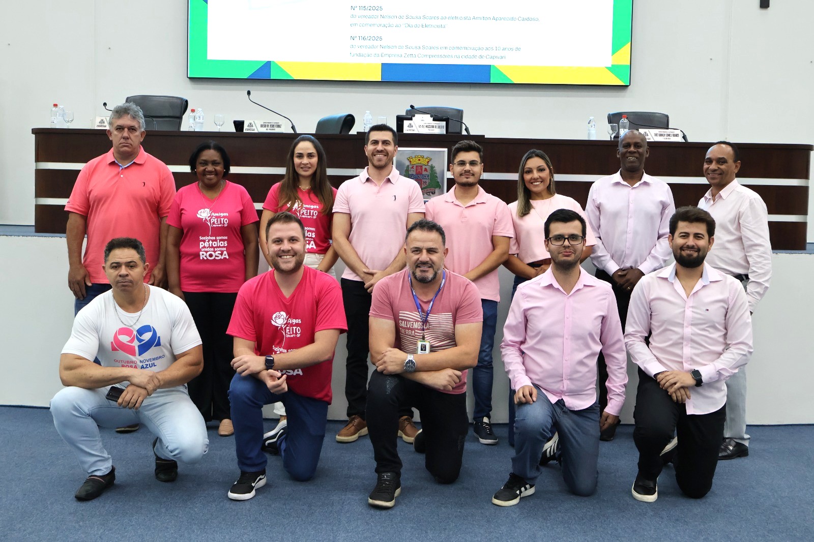 A Câmara Municipal de Capivari realizou, na última segunda-feira (13), a 32ª Sessão Ordinária de 2025, com todos os vereadores vestidos de rosa em apoio ao Mês do Combate ao Câncer de Mama. Durante o expediente, foi encaminhado às comissões permanentes um Projeto de Lei Complementar de autoria do Executivo. Na ocasião, os parlamentares também aprovaram um requerimento, três moções de congratulações e 14 projetos de lei encaminhados pelo Poder Executivo, além de apresentarem seis indicações com sugestões e demandas voltadas ao município.