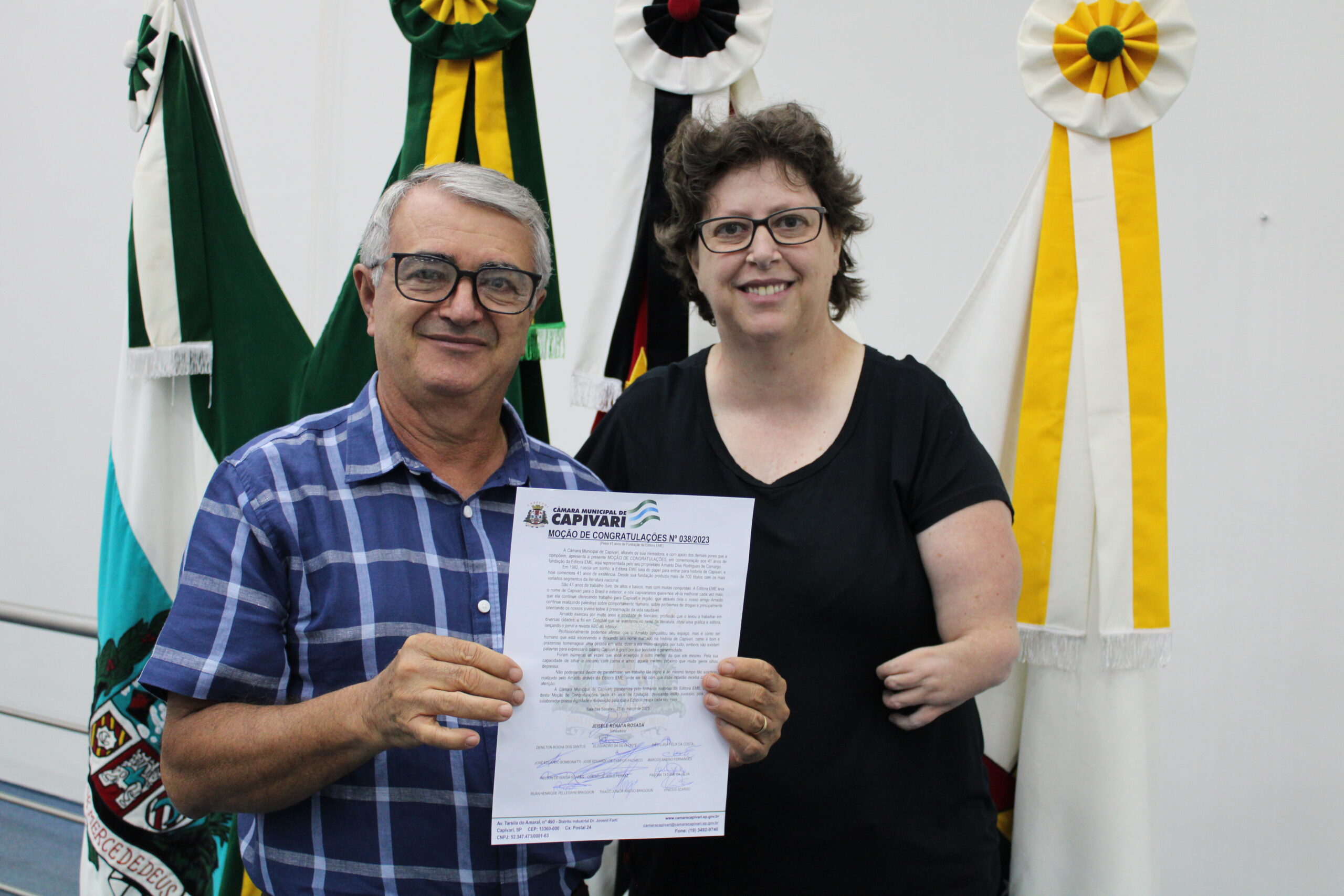 Na noite da última segunda-feira, 03, durante a 9ª sessão ordinária da Câmara Municipal de Capivari, a vereadora Sele Rosada (União Brasil) realizou a entrega da Moção de Congratulações nº 38/2023, aprovada na semana passada, ao senhor Arnaldo Divo Rodrigues de Camargo pelos 41 anos de fundação da Editora EME.