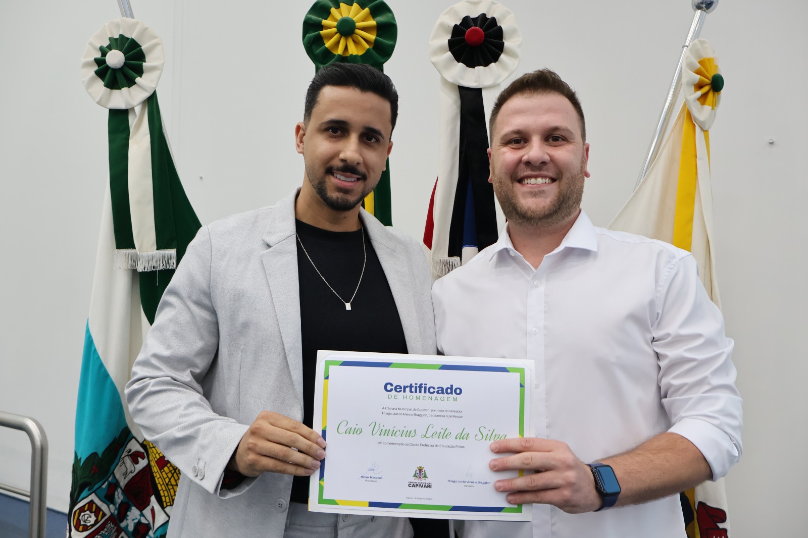 Na ocasião, foi entregue a Moção nº 81/2025, dedicada ao professor Caio Vinícius Leite da Silva, conhecido como Caio Ferreira, em reconhecimento a todos os professores de Educação Física de Capivari. A homenagem, alusiva ao Dia do Professor de Educação Física (1º de setembro), celebrou o papel essencial desses profissionais na promoção da saúde, do bem-estar e da qualidade de vida da população.