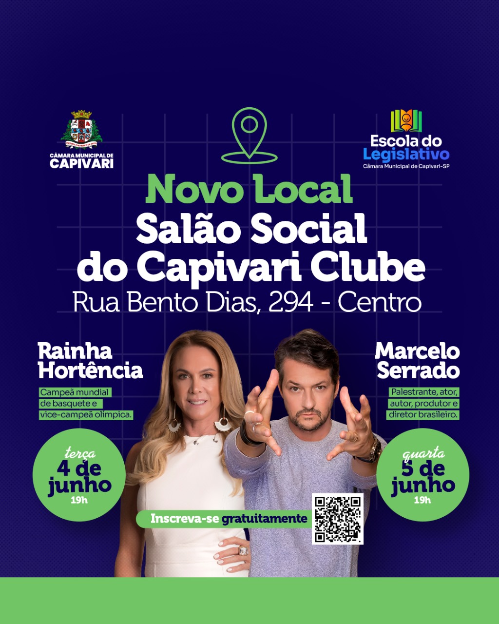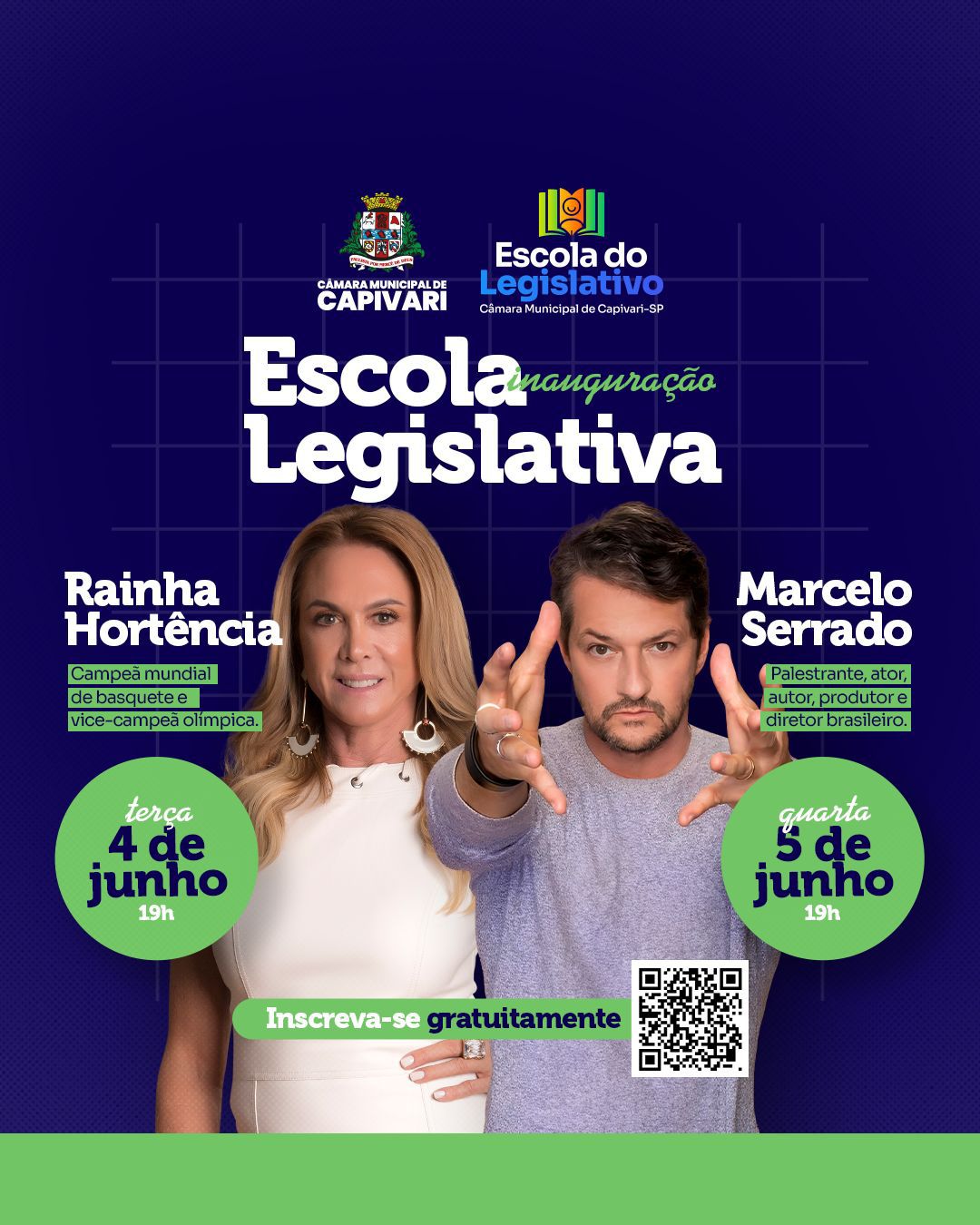 A Escola do Legislativo da Câmara Municipal de Capivari será lançada com as palestras da ex-jogadora de basquete multicampeã, a Rainha Hortência da Seleção Brasileira e de diversos times do País, e do ator e produtor Marcelo Serrado. O evento acontecerá nos próximos dias 4 e 5, a partir das 19h, no Salão Social Capivari Clube. A participação é gratuita para toda a população e os interessados devem se inscrever antecipadamente pelo site https://escola.capivari.sp.leg.br.