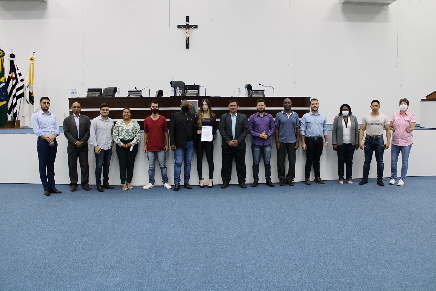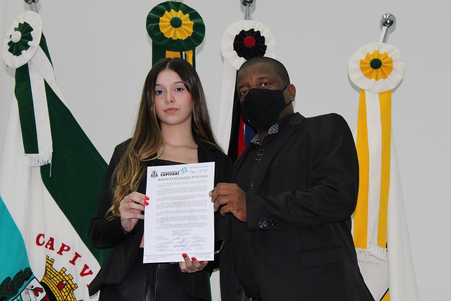 Logo em seguida, outra jovem capivariana foi homenageada: Valéria Rodrigues Henrique, vencedora no Concurso Nacional Científico Cultural, promovido pelo curso de graduação de Ciência dos Alimentos da Esalq-USP (campus Piracicaba). Ela recebeu uma Moção de Aplausos, também aprovada por unanimidade, de autoria do vereador Ruan Henrique Pellegrini Braggion (Republicanos).