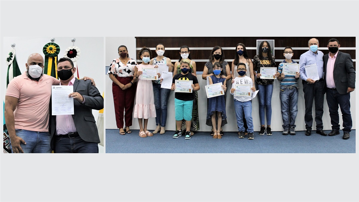 Na mesma noite, Du Bombonatti prestou outra homenagem junto com a vereadora Paloma Tatiane da Silva (PP), com a entrega de uma Moção de Aplausos aos alunos e professores que participaram do Concurso Cultural “Cooperativismo: Uma forma de Viver”, apoiado pelo Sicoob Cooplivre, cujo objetivo foi o de difundir o conceito de cooperação nas crianças. Os alunos Evelyn Pereira Guimarães, Henry Gabriel de Macedo Leite, Sophia Ramos Rossi, Layon Rafael de Andrade, Marcos Vinícius Pacheco Pavioti, Ashley de Azevedo Andrade de Santana e Kaique Gabriel Moreira da Silva e as professoras Kátia de Moraes, Adriana Morelli, Denise Vieira dos Santos e Cristiane Rodrigues estiveram presentes para receber a homenagem, além do vice-presidente do Sicoob Cooplivre, Arlindo Batagin.