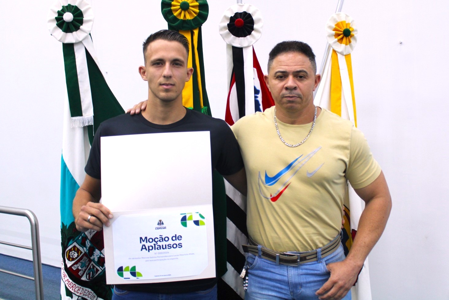 O vereador Marquinhos Mineiro entregou Moção de Aplausos ao atleta Lucas Maurício Alves por sua participação no esporte. A homenagem ao lutador de muay thai, o boxe tailandês, aconteceu no Plenário da Câmara Municipal, durante a 20ª Sessão Ordinária, realizada na noite desta segunda-feira (17).