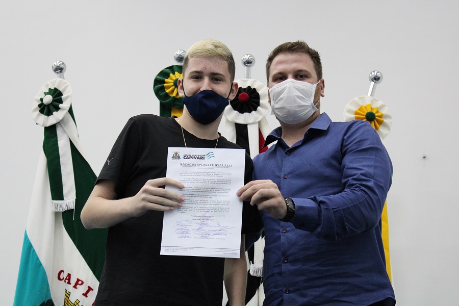 Outra homenagem realizada na 1ª sessão ordinária foi para o aluno Giovanni Pavan pelo ótimo desempenho na Olimpíada Brasileira de Matemática. A Moção de Aplausos, de autoria do vereador Thiago Braggion (PSL), também foi aprovada por unanimidade.