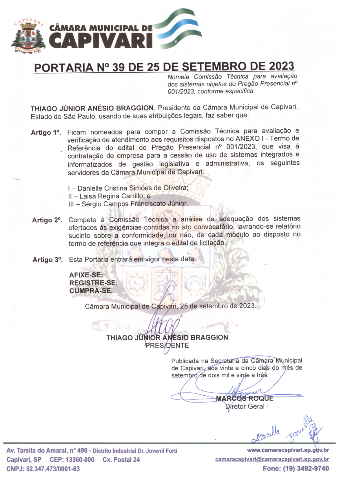 Edital do Pregão Presencial 001/2023 Portaria nº 39 – Nomeação da equipe técnica Retomada da sessão pública do pregão Ata da sessão de abertura e suspensão - 22/09/2023 Ata apresentação do sistema legislativo 02/10/2023 Ata de encerramento - 06/10/2023 Termo de Homologação