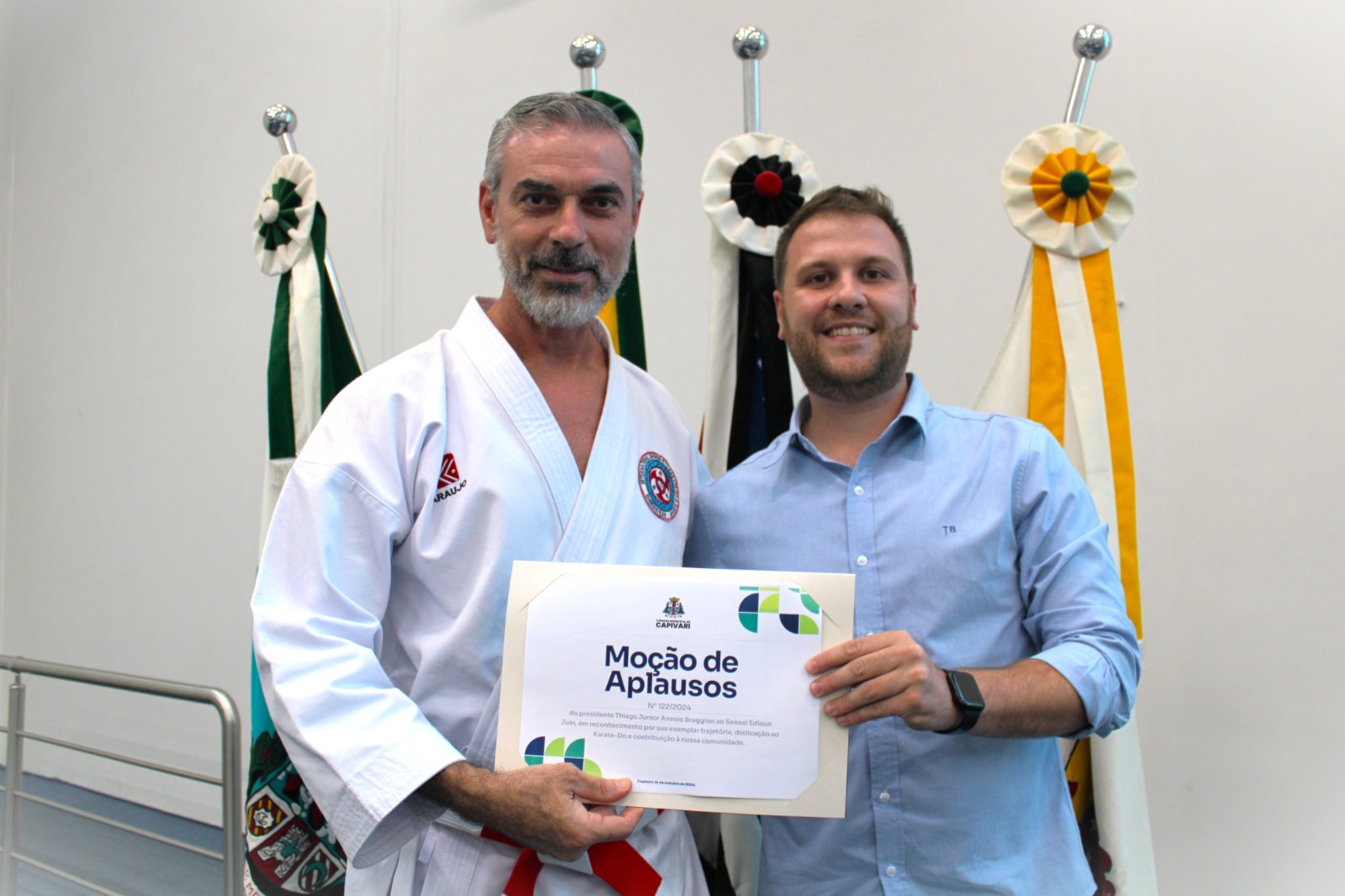 Durante a 35ª Sessão Ordinária, realizada em 4 de novembro, o presidente da Câmara Municipal de Capivari, Thiago Braggion (PP), entregou uma Moção de Aplausos ao Sensei Edison Zuin, em reconhecimento aos seus 38 anos de dedicação às artes marciais e à formação de jovens.