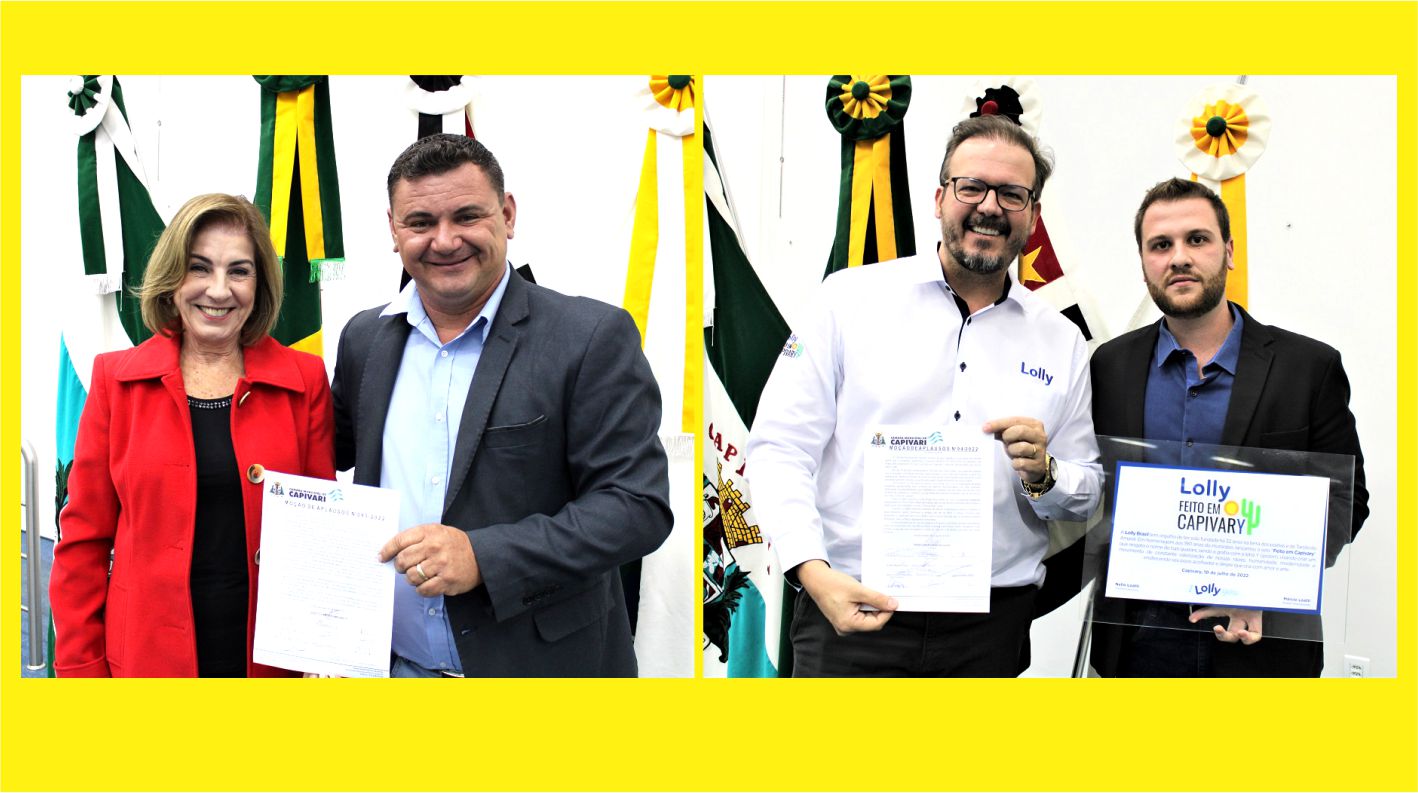 Outra Moção de Aplausos foi entregue durante a 26ª sessão ordinária – também aprovada por unanimidade. A empresa Lolly Brasil recebeu a homenagem do vereador Thiago Braggion (União Brasil) pela criação do selo “Feito em Capivary”, desenvolvido em homenagem aos 190 anos da cidade, comemorado em julho deste ano.