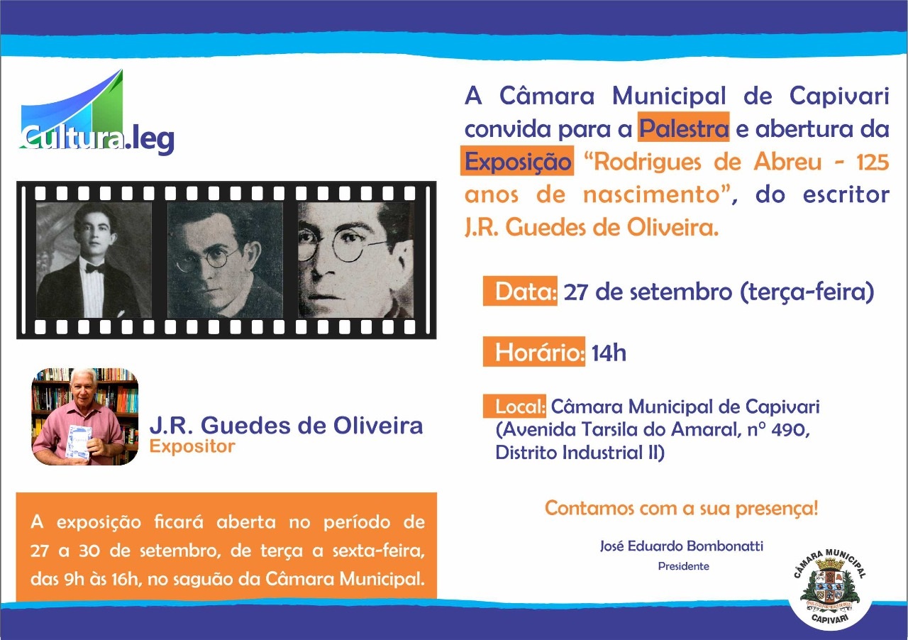 A Câmara Municipal de Capivari promove na próxima terça-feira, 27, às 14h, a abertura da exposição “Rodrigues de Abreu – 125 anos de Nascimento”, seguida de uma palestra sobre o tema promovida pelo escritor J. R. Guedes.