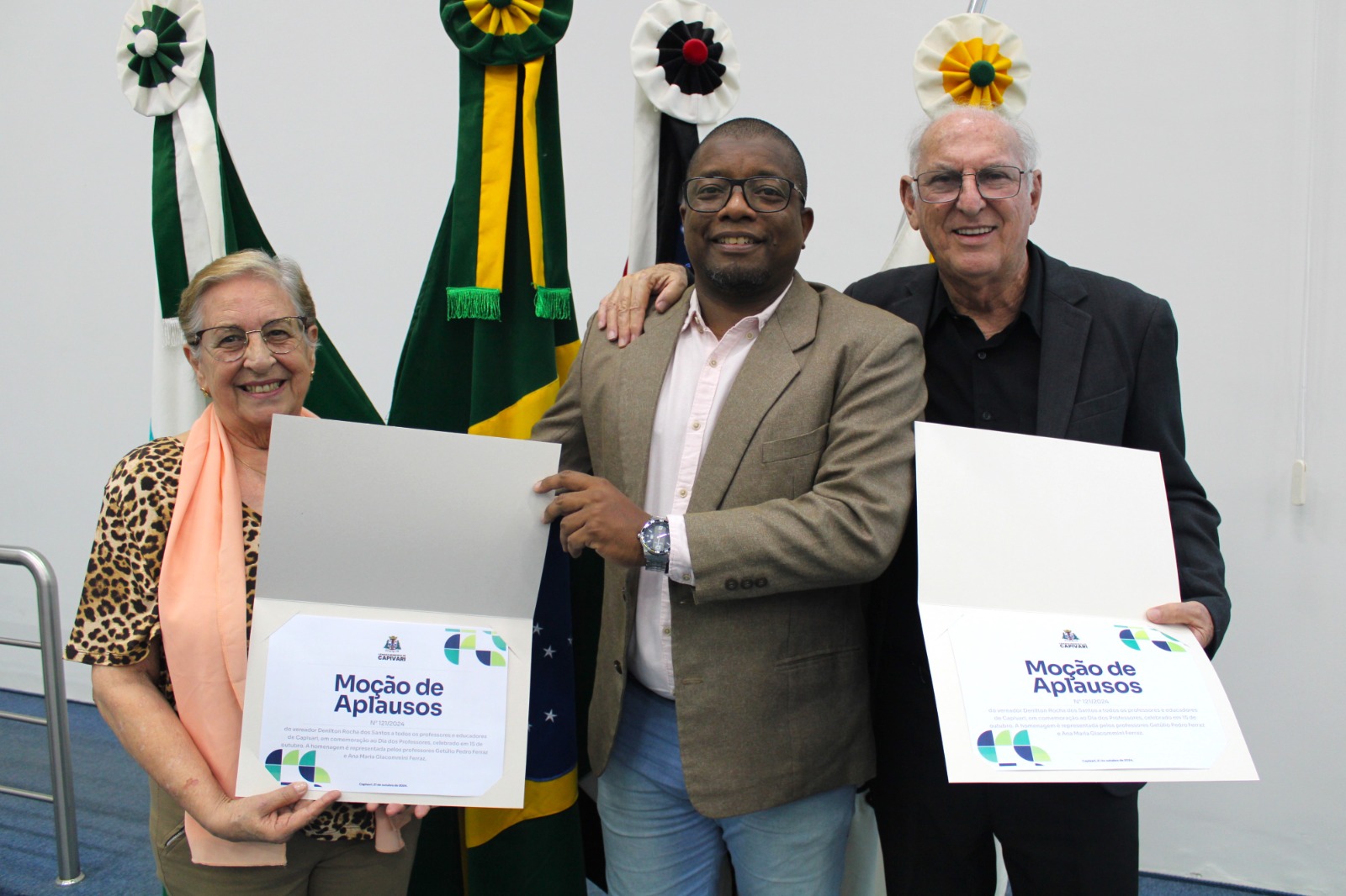 Na 33ª Sessão Ordinária, dia 21, a Câmara Municipal de Capivari, através do vereador Denilton Rocha, realizou a entrega da Moção de Aplausos que homenageia todos os professores e educadores do município pelo seu dia, celebrado anualmente em 15 de outubro.