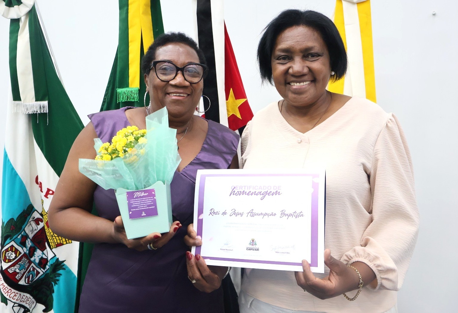 Durante o evento em comemoração ao Dia da Mulher, realizado na Câmara Municipal de Capivari no dia 16 de março, após a 7ª Sessão Ordinária, a vereadora Inês Félix (PL) prestou homenagem à senhora Rozi de Jesus Assumpção Batista, reconhecendo sua trajetória de dedicação, acolhimento e contribuição à comunidade.