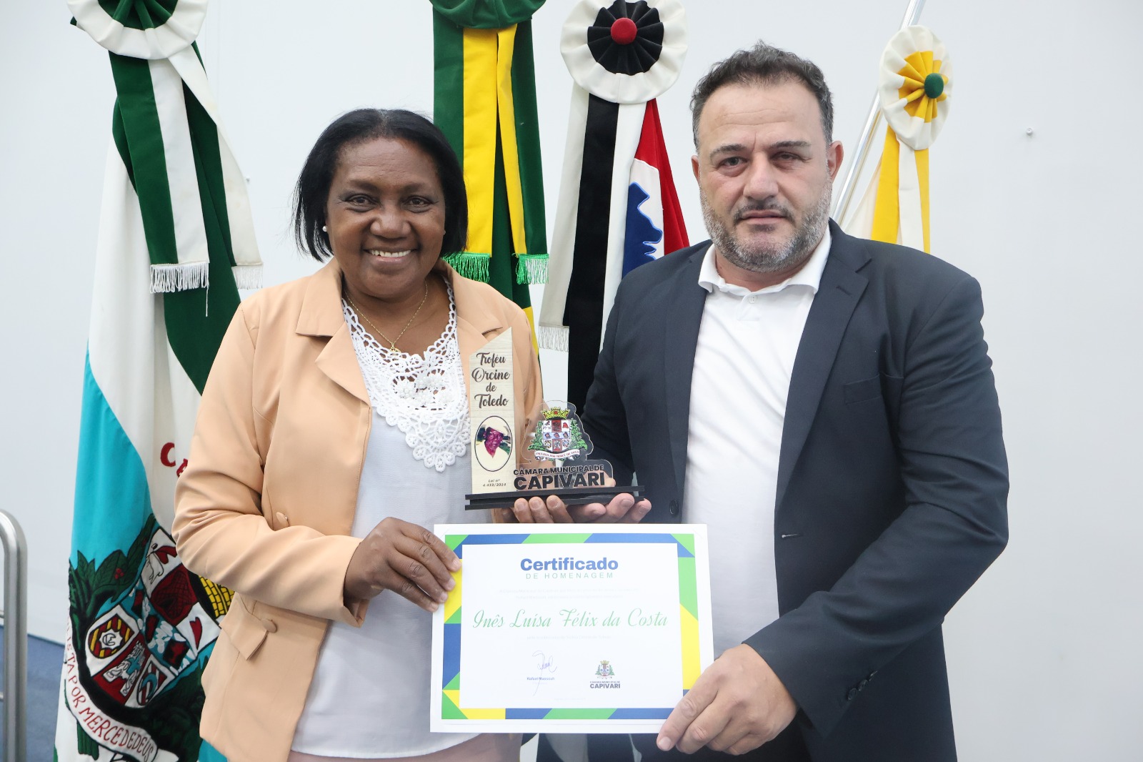 Em uma noite marcada por emoção, reconhecimento e celebração da luta por igualdade e justiça social, a Câmara Municipal de Capivari concedeu o Troféu Orcine de Toledo à vereadora Inês Luísa Félix (PL). A homenagem, que não era realizada desde 2021, foi retomada pelo presidente da Câmara, Rafael Massouh (PL), e reuniu autoridades, familiares, amigos e membros da comunidade local.