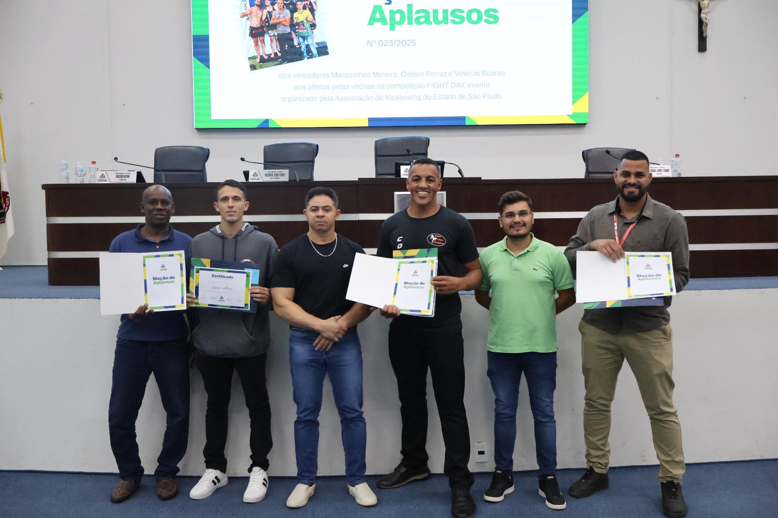 Na noite da última segunda-feira (28), logo após a 13ª Sessão Ordinária, os vereadores Marquinhos Mineiro (PSD), Odésio Ferraz (PSD) e Vinicius Scarso (MDB) entregaram uma Moção de Aplausos às equipes capivarianas Goes Team e Alves Team, em reconhecimento pelas vitórias conquistadas na competição Fight Day, realizada em Piracicaba.
