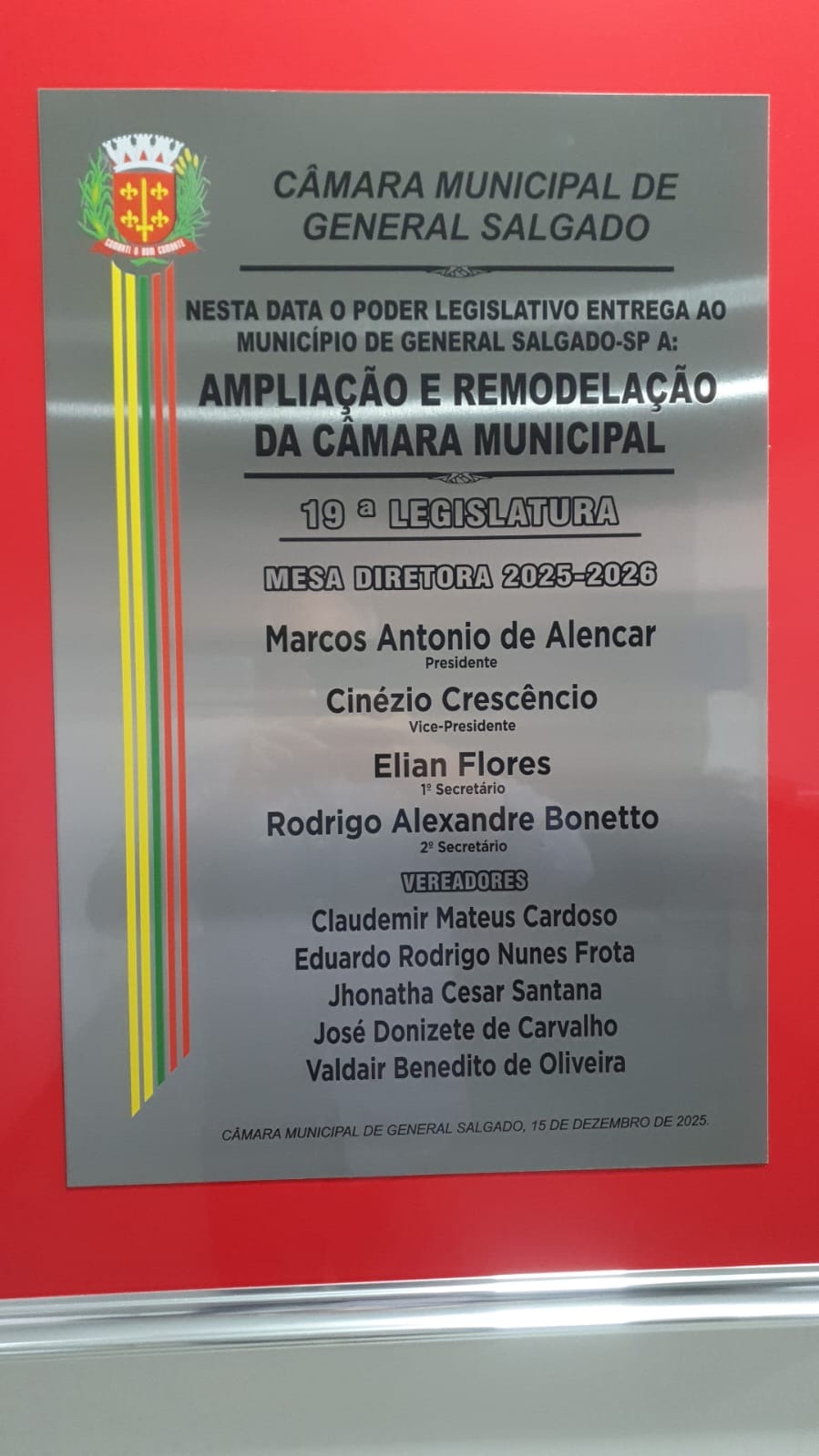 Nesta segunda-feira dia 15 de dezembro de 2025, foi descerrado a placa inaugural da ampliação e remodelação da Câmara Municipal de General Salgado, que contou com a presença de todos os vereadores deste Legislativo, bem como com a presença de alguns ex-vereadores, vice-prefeito e visitantes, que puderam conhecer as novas instalações da Câmara Municipal de General Salgado.