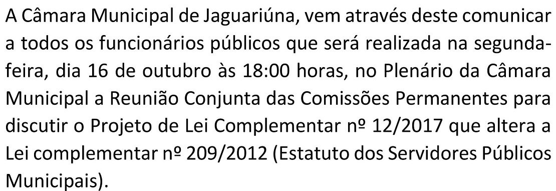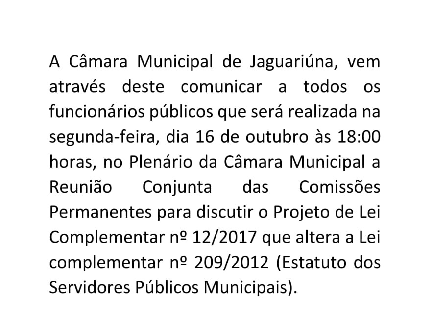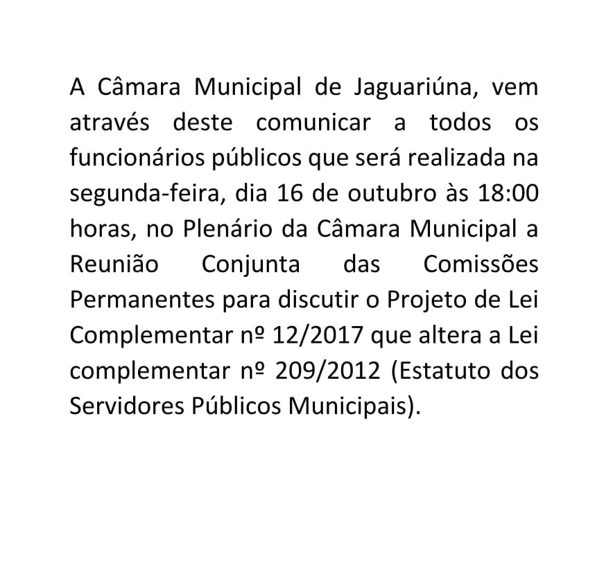A Câmara Municipal de Jaguariúna, vem através deste comunicar a todos os funcionários públicos que será realizada na segunda-feira, dia 16 de outubro às 18:00 horas, no Plenário da Câmara Municipal a Reunião Conjunta das Comissões Permanentes para discutir o Projeto de Lei…