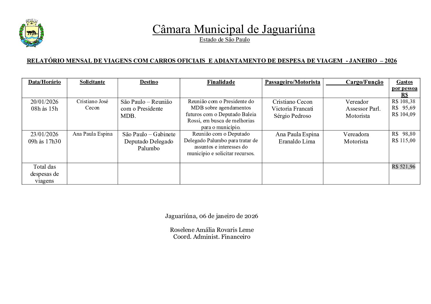 Câmara Municipal de JaguariúnaPublicaçõesDiárias e PassagensRelatório Mensal de Viagens com Carros Oficiais e Adiantamento de Despesa de Viagem - Janeiro/2026