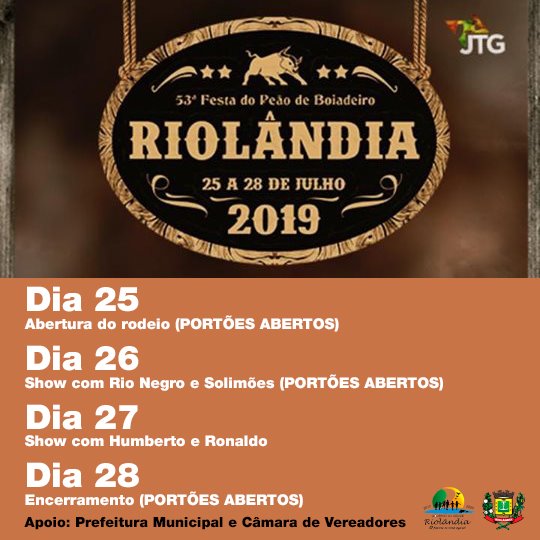 RIOLÂNDIA É QUE TEM RODEIO BÃO" 🐎 De 25 a 28 de Julho acontece a grandiosa 53ª Festa do Peão de Riolândia. . Quinta-feira dia 25 - Abertura do rodeio (PORTÕES ABERTOS) Sexta-feira dia 26 - Show com Rio Negro e Solimões (PORTÕES ABERTOS) Sábado dia 27 - Show com Humberto…