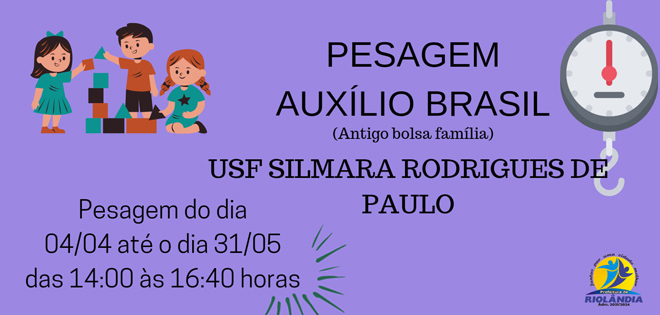 Pesagem do Auxílio Brasil no USF SILMARA RODRIGUES DE PAULO, vai do dia 04/04 até o dia 31/05 das 14:00 às 16:40 horas.