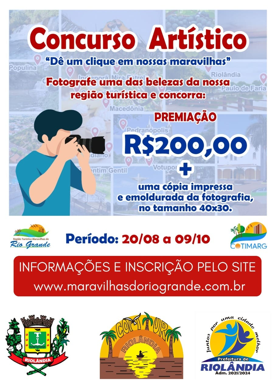 Dê um clique em nossas maravilhas. Fotografe uma das belezas da nossa região turistica e concorra a uma premiação de R$200,00 + uma cópia impressa e emoldurada da fotografia no tamanho 40x30cm As inscrições vão ate o dia 09/10 pelo site www.maravilhasdoriogrande.com.br