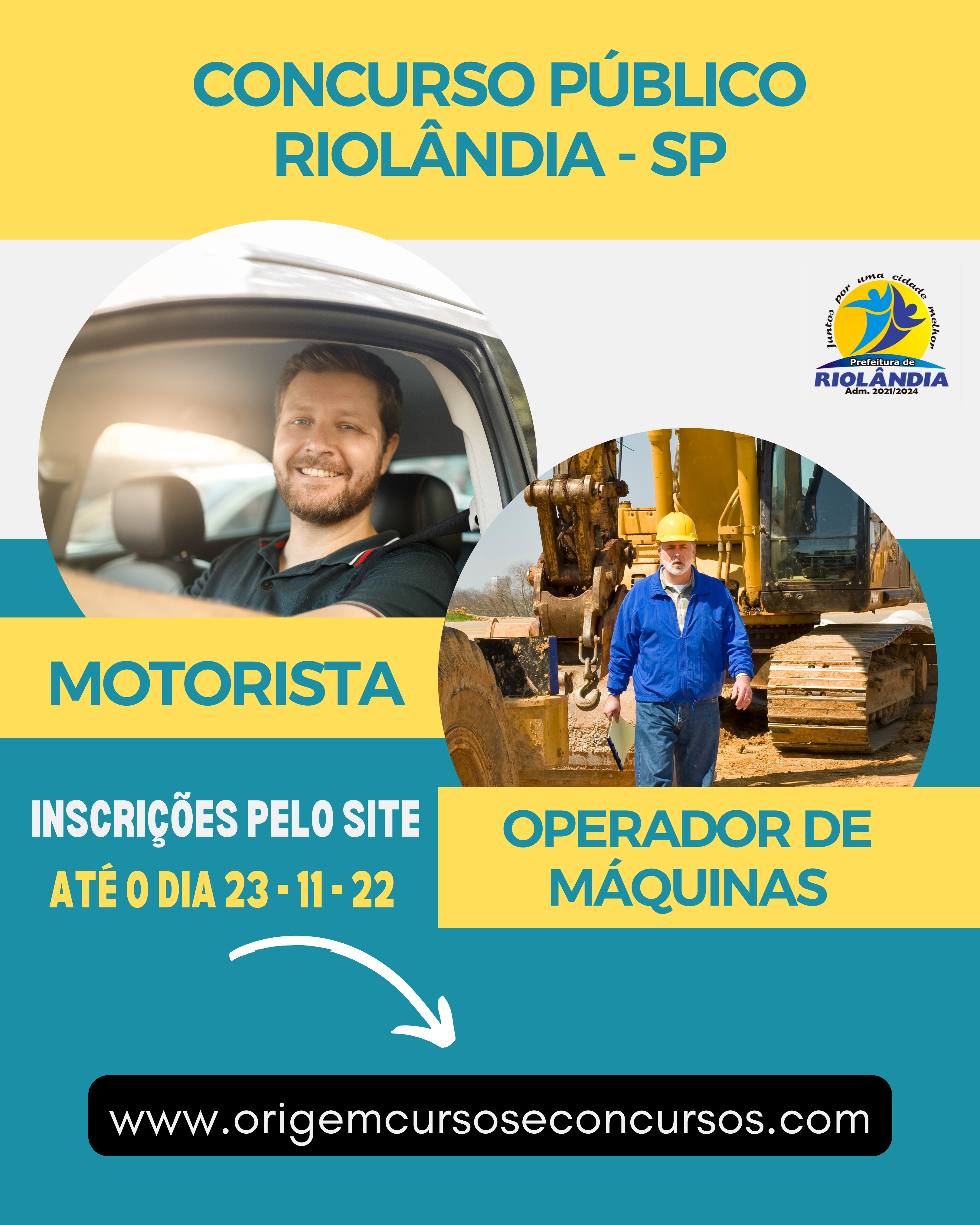 Riolândia lança Edital para Concurso Público As vagas de emprego são para Motorista e Operador de Máquinas e as inscrições são pelo site www.origemcursoseconcursos.com somente até o dia 23-11-22 Todo edital está anexado no site e na página oficial da prefeitura no facebook.