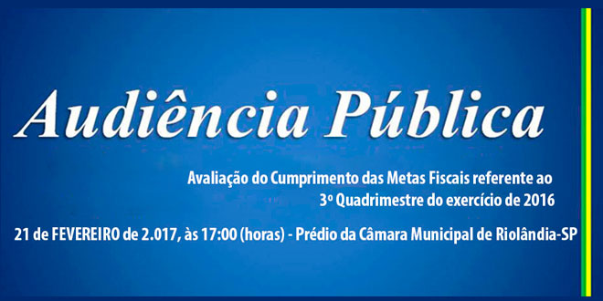 A PREFEITURA MUNICIPAL DE RIOLANDIA convida a População em geral para participar de uma AUDIÊNCIA PUBLICA que se realizará no próximo dia 22 de FEVEREIRO de 2.017, às 16:00 (horas), no prédio da Câmara Municipal de Riolândia-SP, situado a rua oito nº 511 esquina com à avenida nove, oportunidade em que será discutida a seguinte pauta: