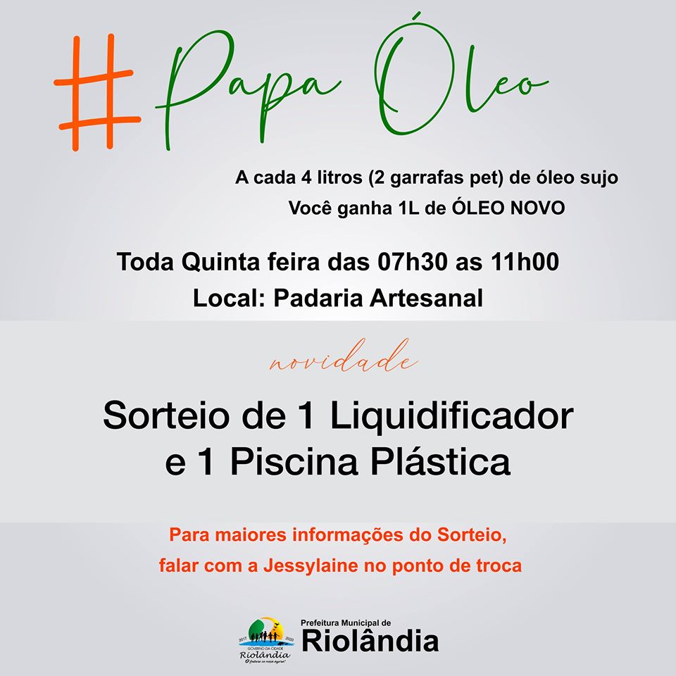 🍃 #PapaÓleo 🍃 O projeto PAPA ÓLEO além de realizar o descarte correto do óleo usado, irá sortear 1 Liquidificador novinho e 1 Piscina Plástica de 1000L A cada 4 litros de óleo sujo entregues, você ganha 1L de óleo novo + 1 Cupom para concorrer! Participe e ajude…