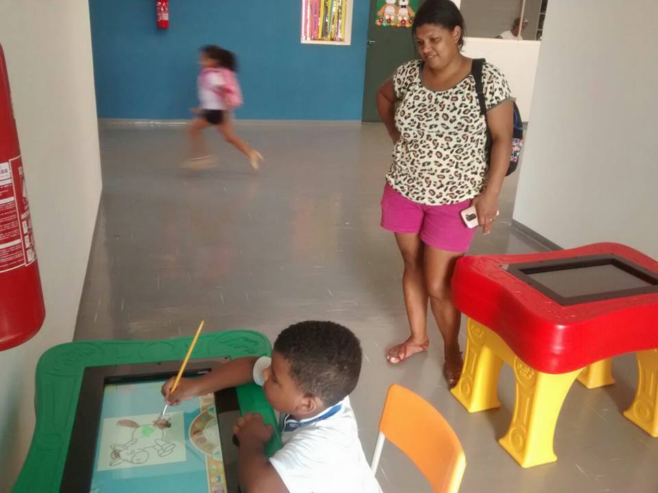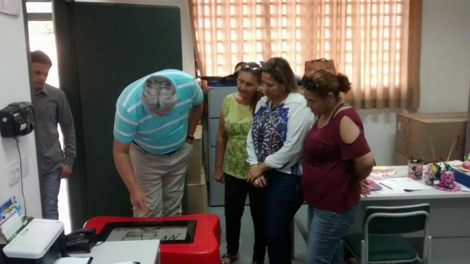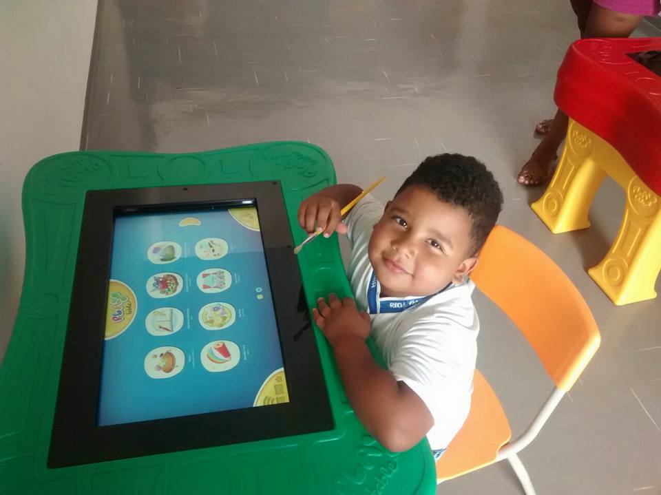 José Frederico de apenas 04 anos, ficou maravilhado com o que via. Não deu atenção para a mãe Joana que olhava atentamente a felicidade do filho. Encantado, só dava atenção às cores dos desenhos que surgiam com o toque do pincel. A tela faz parte das 20 mesas digitais adquiridas pela Prefeitura Municipal de Riolândia e será complemento no processo de ensino/ aprendizagem nas creches e pré escola.